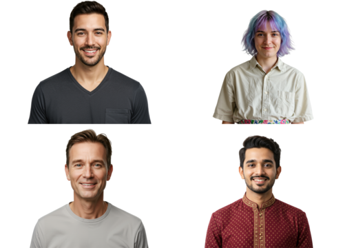 A Diverse Group of Four Males Featuring Different Ethnicities, Hairstyles, and Clothing Styles, Smiling Against a transparent background