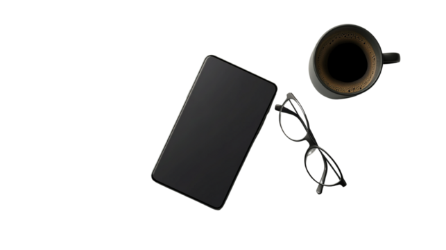 Minimalist workspace setup featuring a phone, glasses, and a cup of coffee on black