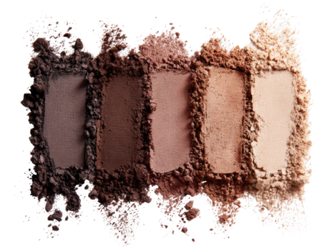 Four shades of eyeshadow powder,  various tones of brown and beige,  textured, on transparent background