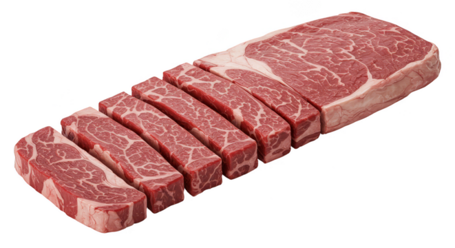 Isolated Sliced Raw Marbled Beef Steak Cuts On Transparent Background