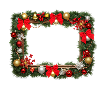 Festive Christmas frame decorated with traditional holiday ornaments, featuring lush green garland, shiny red bows, sparkling gold and silver baubles, and vibrant red berries, creating a joyful border