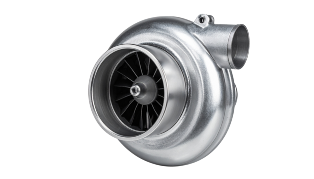 Metal shiny turbocharger car detail on transparent background for auto industry isolated on solid white background