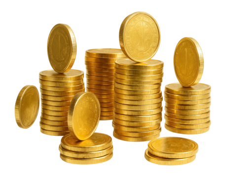 Four stacks of shiny golden coins on a clean white background, symbolizing wealth and finance.