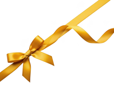 A beautiful shiny golden satin ribbon tied in a bow with a flowing wavy tail, isolated on transparent background for celebration and gift wrapping