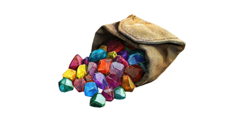 Colorful Gemstones Spilling From Burlap Sack. Symbol Of Wealth And Treasure Isolated On Transparent Background