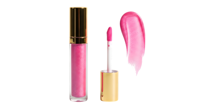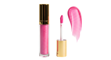 A shiny pink lip gloss tube with a golden cap and applicator, next to a swatch of the glossy pink lip product, isolated on transparent background