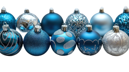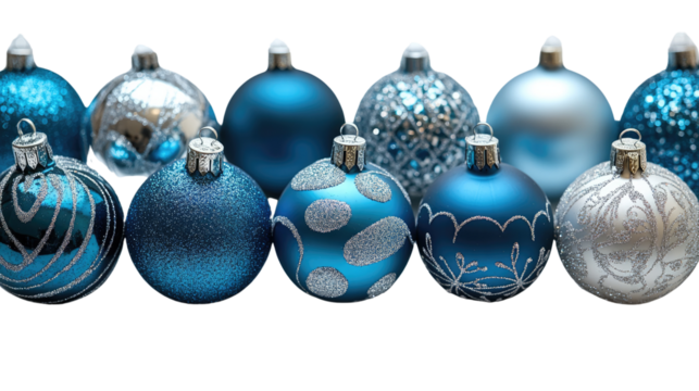 Hanging christmas ornaments in silver and blue against a dark on transparent background