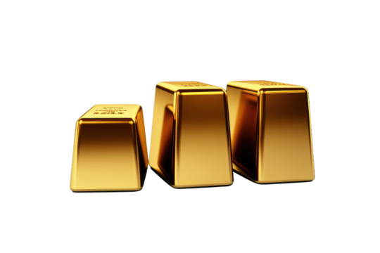 Three polished gold bars stacked in a pyramid formation on a white background isolated on a transparent background