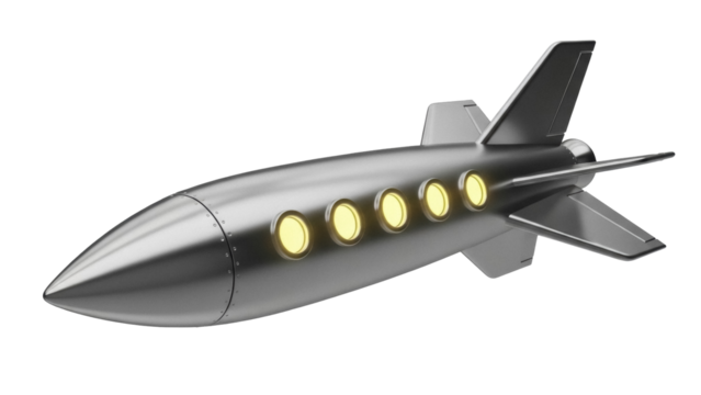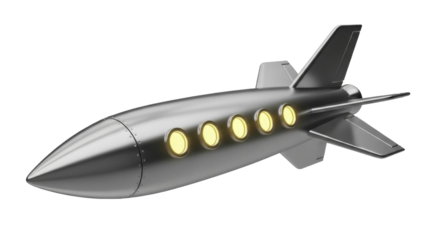 Silver retro rocket ship PNG isolated on transparent background, vintage space shuttle for science fiction and aerospace themes