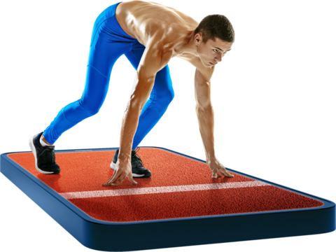 Focused male sprinter in starting position ready to race showing muscular physique isolated on transparent background