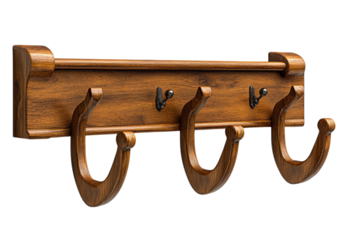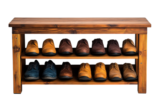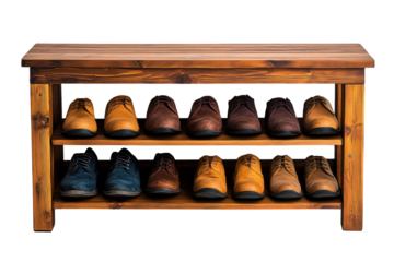 A wooden shoe rack with three shelves on transparent background