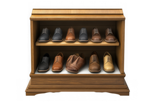 Wooden shoe rack with various types of footwear isolated on transparent background