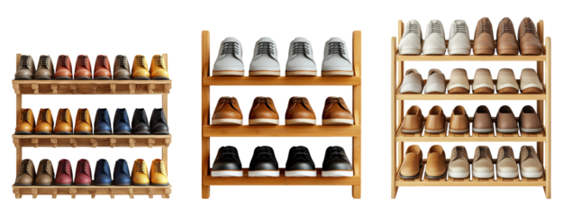 Three shoe racks displaying various types of footwear on a transparent background