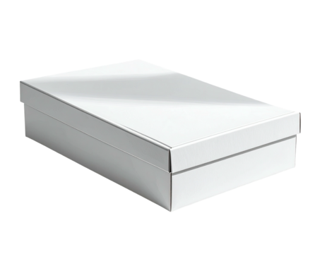 Men? dress shoes in an open shoebox with wrapping paper pulled aside, transparent background,