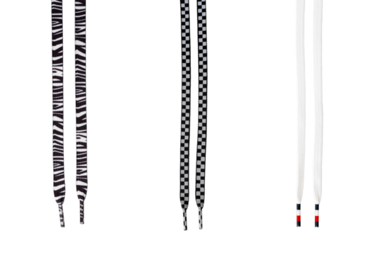 Stylish zebra, checkerboard, and classic white shoelaces on black background.