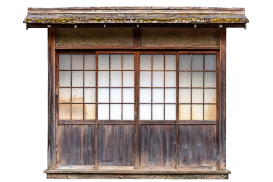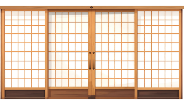 A traditional japanese room interior featuring wooden shoji screen doors and panels isolated on transparent background