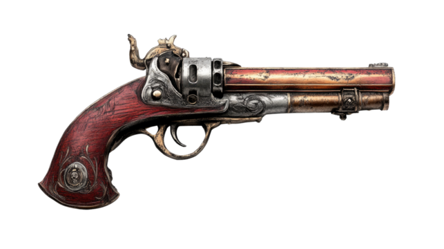 Old pirate flintlock pistol, pirate gun weapon isolated on a transparent background, cutout PNG file