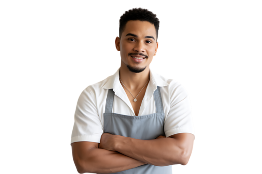 Young man wearing apron isolated on transparent background