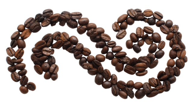 Coffee beans arranged in an artistic swirl on a white isolated background.