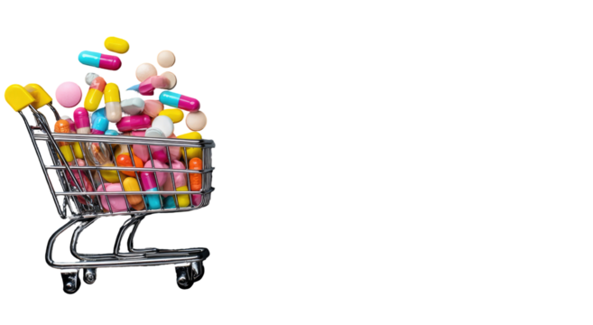 Miniature shopping cart overflowing with colorful pills, capsules, and tablets, on black