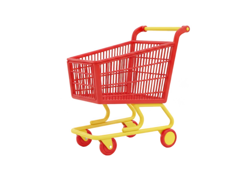A bright red and yellow plastic miniature shopping cart with four wheels isolated on transparent background