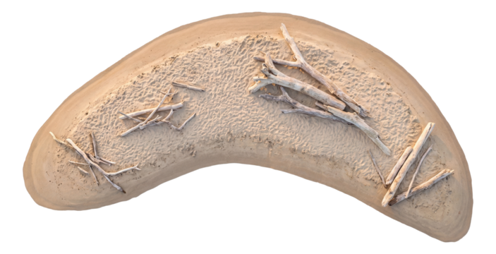 Sandy river bar featuring soft, light sand and scattered driftwood.