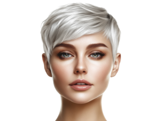 Beautiful young woman with stylish silver gray short wavy hair and professional makeup smiling, isolated on transparent background