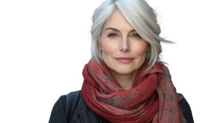 Elegant woman with short silver hair wearing a cozy red scarf, presenting a warm smile, reflecting confidence and beauty against a minimalistic background