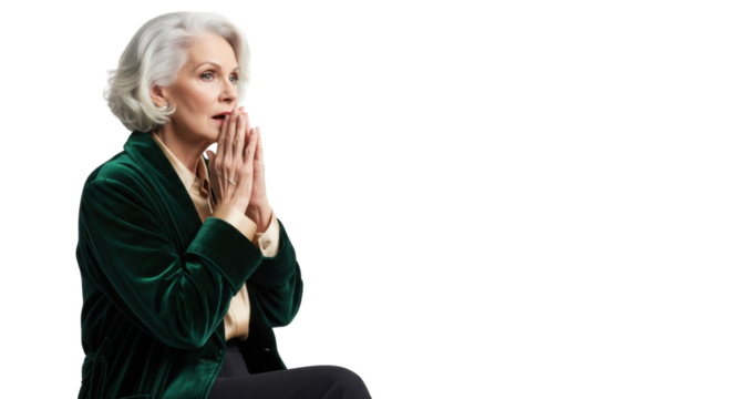 Dignified mature caucasian woman, silver hair, emerald velvet robe, gold undershirt, dark trousers, hands cupped at mouth, solemn gaze, on white studio background with copy space, concept of deep