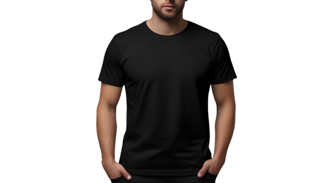 A man wearing Black blank t-shirt front view on a transparent background, clothes on isolated Png background. Png white T shirt