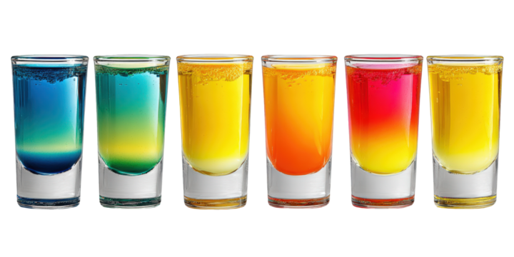 Six colorful alcoholic shots in a row, isolated on transparent background