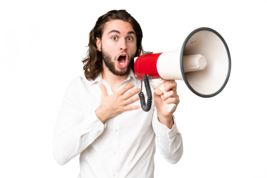 Young handsome man over isolated chroma key background shouting through a megaphone with surprised expression