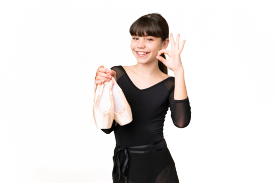 Little caucasian girl practicing ballet over isolated background showing ok sign with fingers