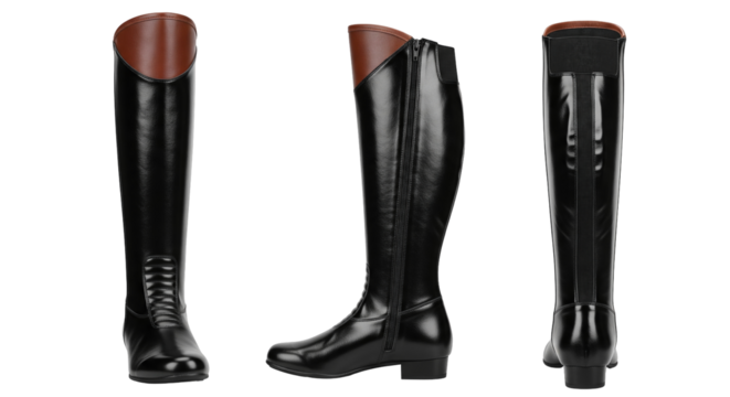 Black leather equestrian riding boot a classic professional footwear in multiple views set