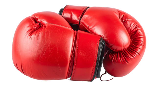 Closeup of a red boxing glove isolated on transparent background, showcasing its leather texture, black wrist strap, and the fist ready for action in the ring