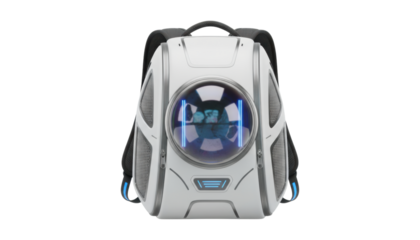Futuristic white pet carrier backpack with a transparent bubble window and glowing blue neon lights reflects a sci-fi interior, showcasing a modern design for animal travel