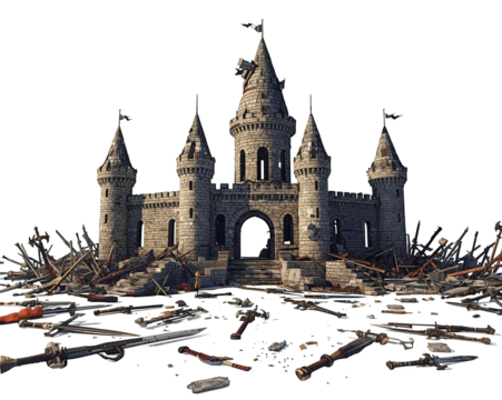 Epic showdown an imposing castle besieged with a multitude of weapons strewn around