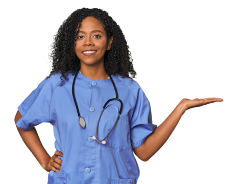 African American nurse in studio background showing a copy space on a palm and holding another hand on waist.