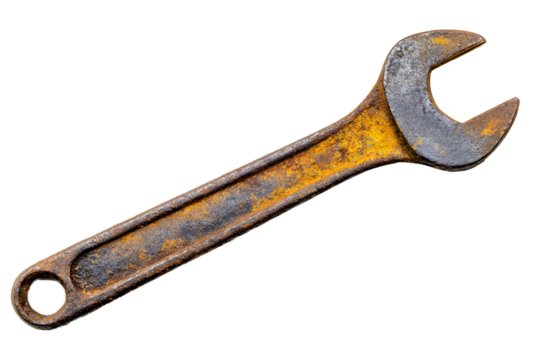 Rusty wrench placed on a white background shows signs of wear and age from many years of use in various mechanical tasks