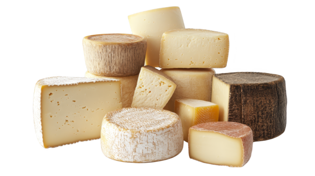 Scattered pieces of delicious hard cheese isolated on transparent background