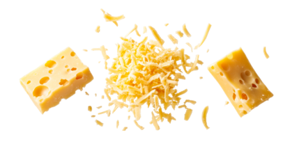 Swiss cheese blocks and grated cheddar, culinary ingredient, cut out transparent