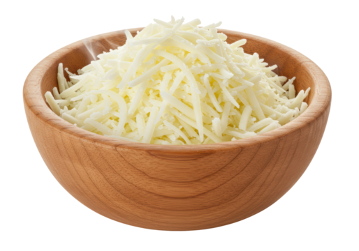 Shredded and Shaved Parmesan Cheese in Round Wooden Bowls on Transparent Background, Italian Dairy Ingredient for Cooking and Garnishing