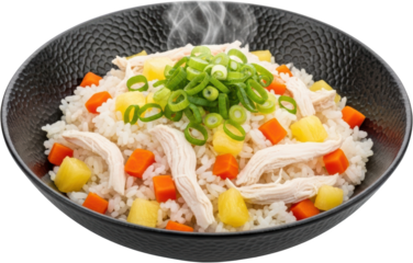 A black bowl filled with steamed white rice shredded chicken diced carrots pineapple chunks and chopped green onions with steam rising Food Asian Food