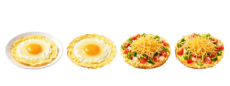 Photograph of four tortillas, first with sunny-side-up egg, next with egg and shredded cheese, next with egg, cheese, and diced tomatoes, and last with egg, cheese, and diced tomatoes and green pepper