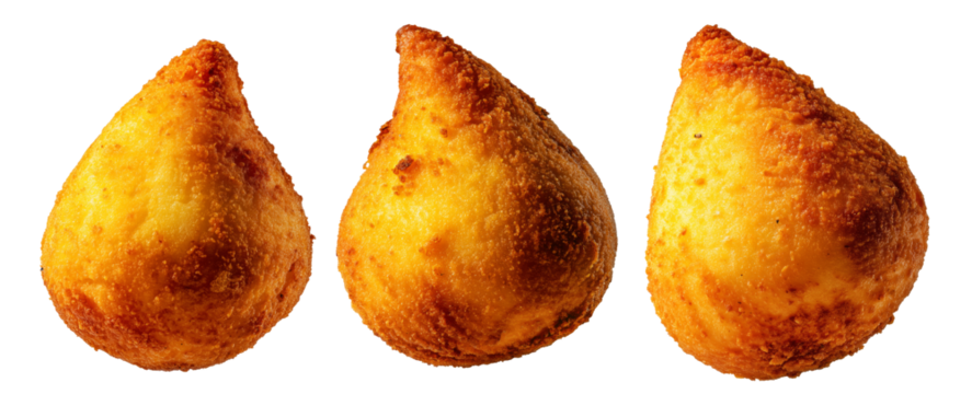 Fried Brazilian coxinhas cone snack filled shredded chicken cheese with golden crispy texture isolated on white background