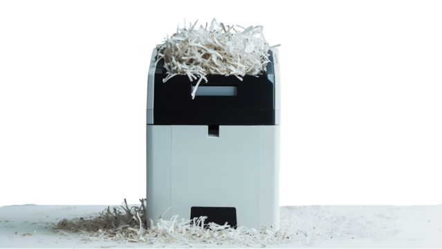 A compact paper shredder with visible shredded paper isolated on a transparent background, PNG