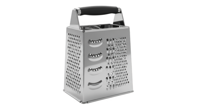 Stainless steel box grater for kitchen use isolated on transparent background