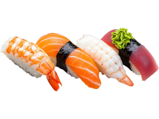 Selection of sushi nigiri with different fish toppings, isolated. Ideal for food illustrations, menus, and culinary presentations.