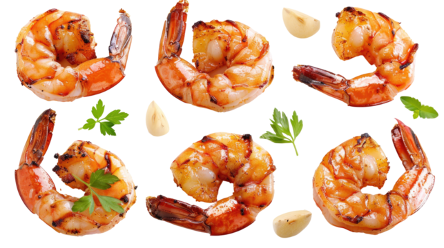 Close-up of grilled shrimp with garlic and parsley in isolated on transparent background