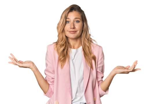 Young blonde in stylish pink suit doubting and shrugging shoulders in questioning gesture.